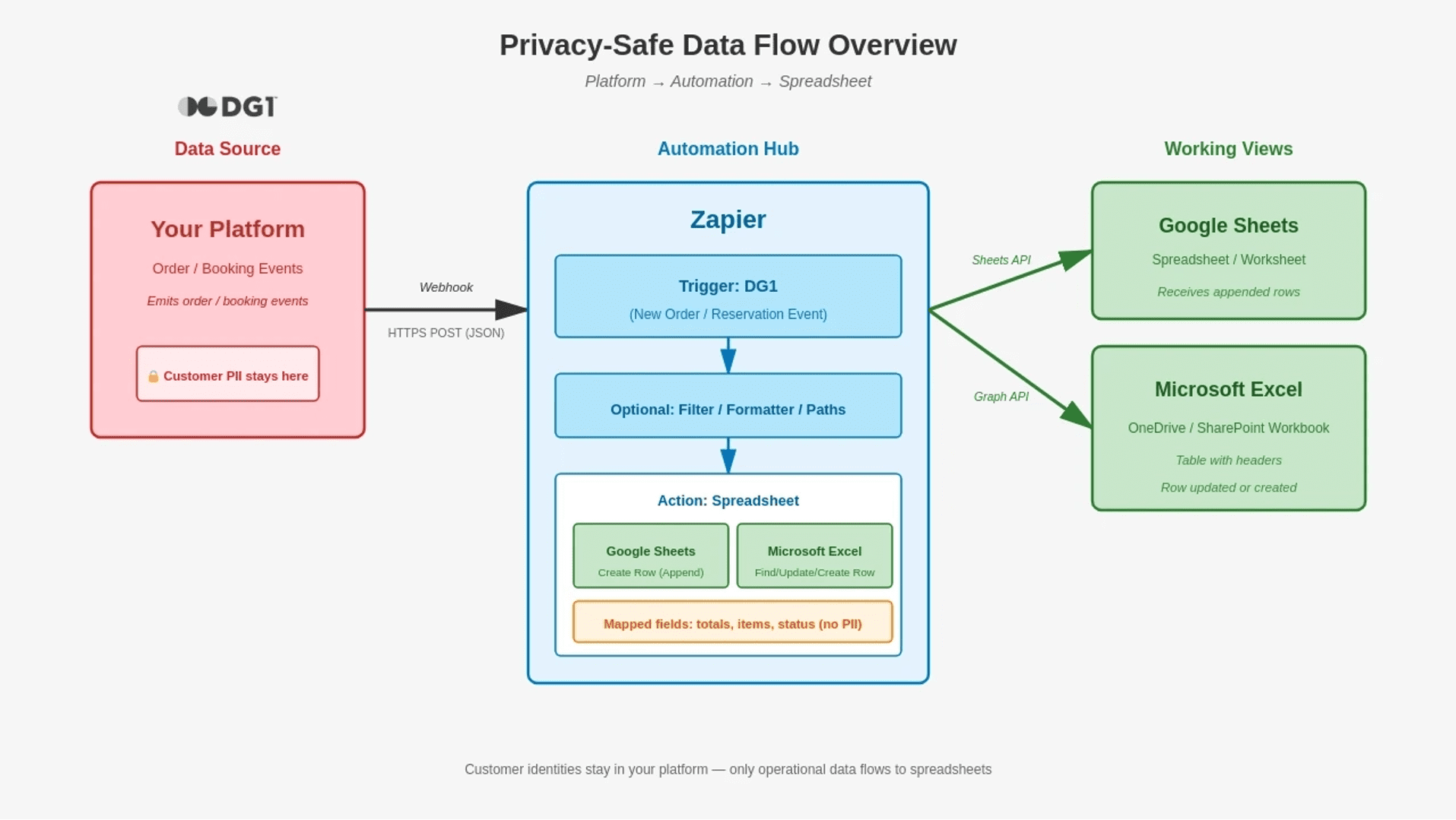 Le principe clé : les identités des clients restent dans votre plateforme ; seules les données opérationnelles sont transmises à la feuille de calcul.